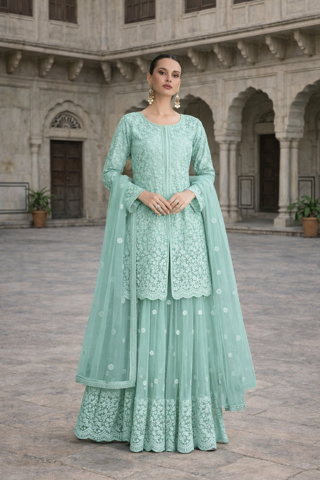 Aqua Mint Embroidered Net Sharara Set With Jacket-Style Kurti & Dupatta