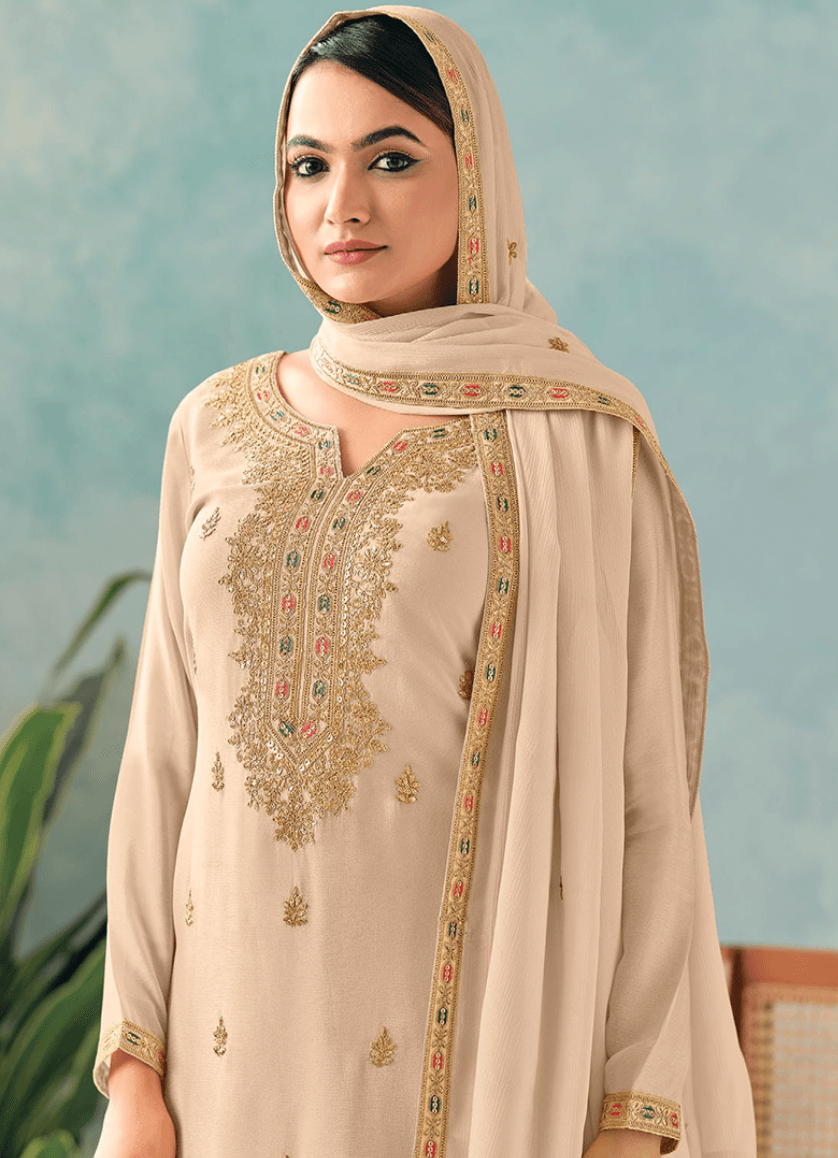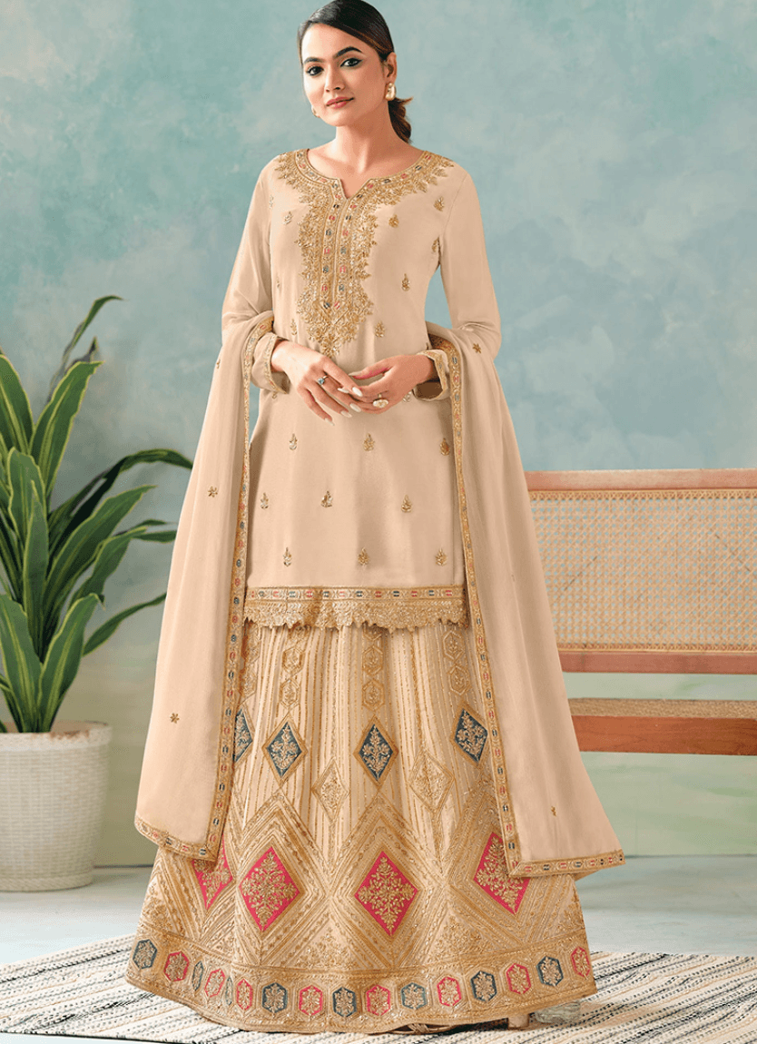Beige Embroidered Kurti Lehenga Set with Dupatta
