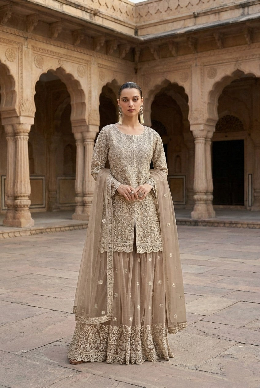 Champagne Embroidered Net Sharara Set With Jacket-Style Kurti & Dupatta