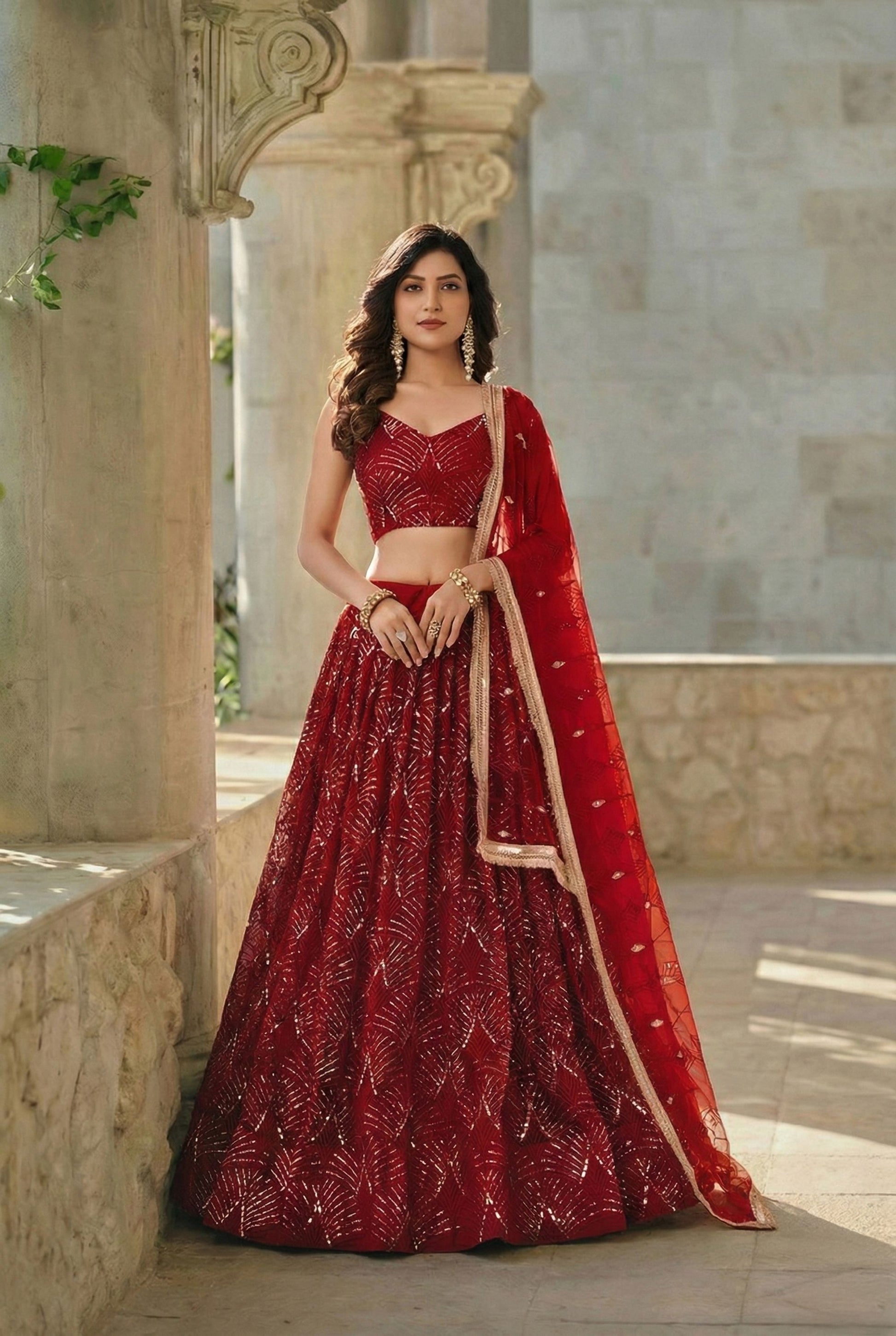 Elevate your festive wardrobe with this classic red lehenga set, beautifully designed with all-over sequin embroidery in an elegant leaf pattern. The coordinated blouse features matching embellishments for a refined look, while the flowing dupatta enhances the ensemble with subtle detailing. Ideal for weddings, receptions, sangeet, and festive celebrations, this lehenga delivers timeless charm with a modern silhouette.