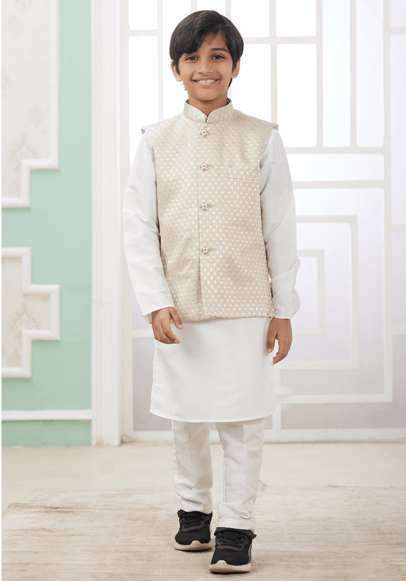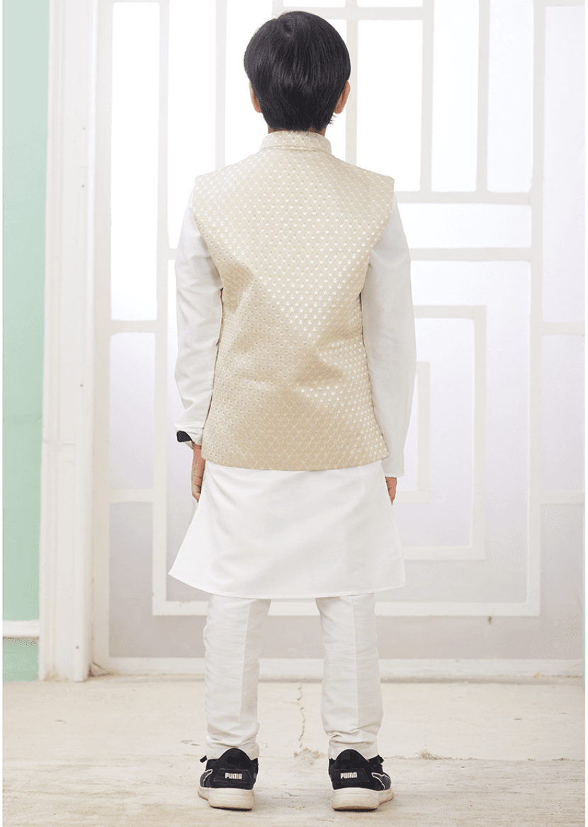 Cream Art Banarasi Silk Printed Readymade Kids Kurta Pajama