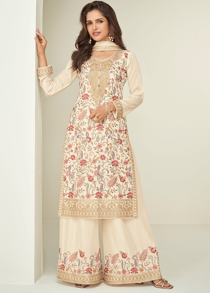 Cream Multicolor Embroidered Kurta Palazzo Set with Dupatta
