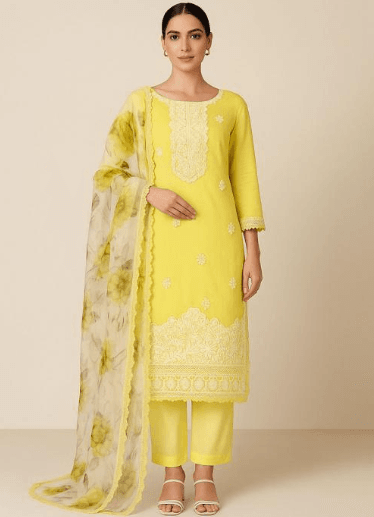 Brighten your ethnic wardrobe with this elegant lemon yellow straight kurta set, beautifully enhanced with delicate embroidery on the neckline, hem, and sleeves. Paired with matching straight pants and a soft floral-printed dupatta, this ensemble offers a perfect blend of freshness and sophistication. Ideal for festive occasions, daytime celebrations, and summer gatherings, this set ensures effortless grace and comfort.