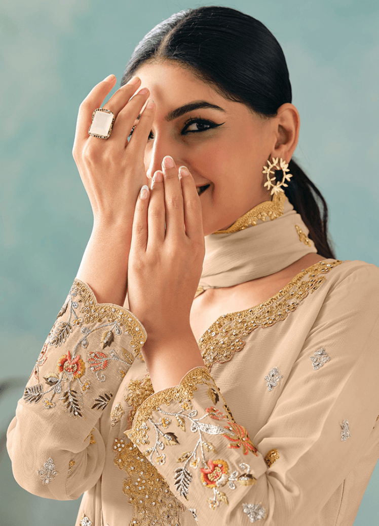Step into timeless elegance with this stunning luxury beige embroidered kurti sharara set, designed with exquisite craftsmanship and delicate detailing to elevate your festive wardrobe. The soft, neutral beige tone is beautifully enhanced with intricate embroidery and shimmering gold accents.